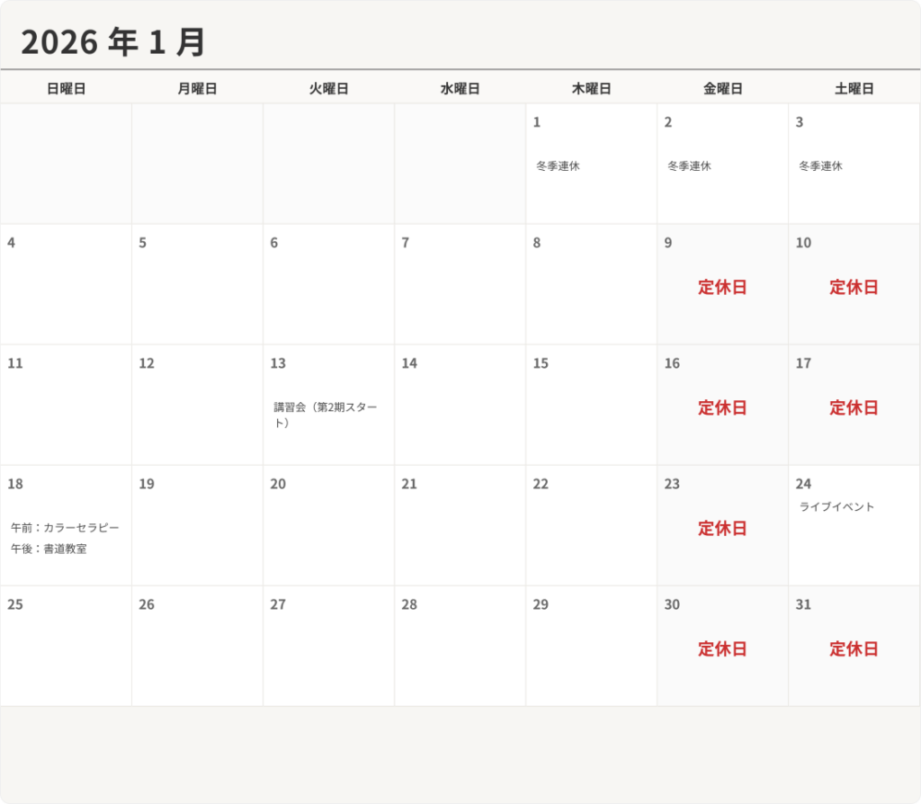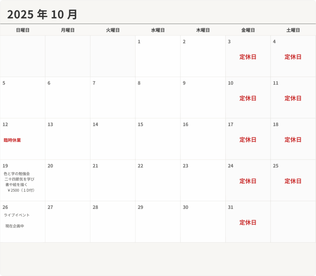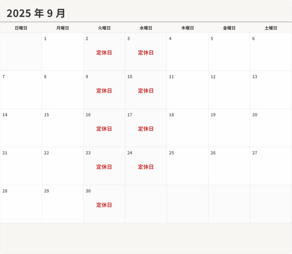 - 定休日:金・土(通常営業は休み)土曜=宿泊/イベント/貸切等:要相談で対応可
